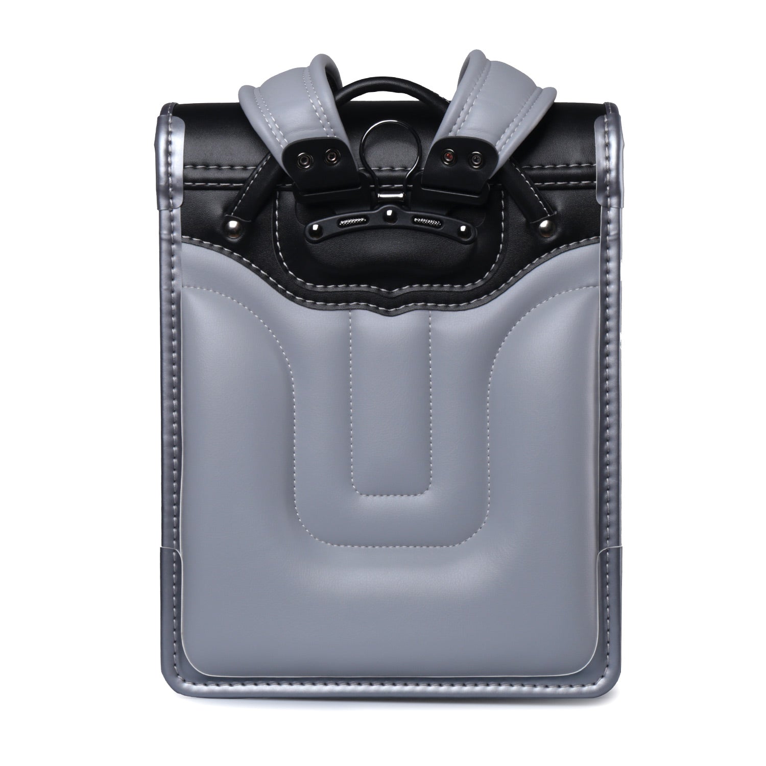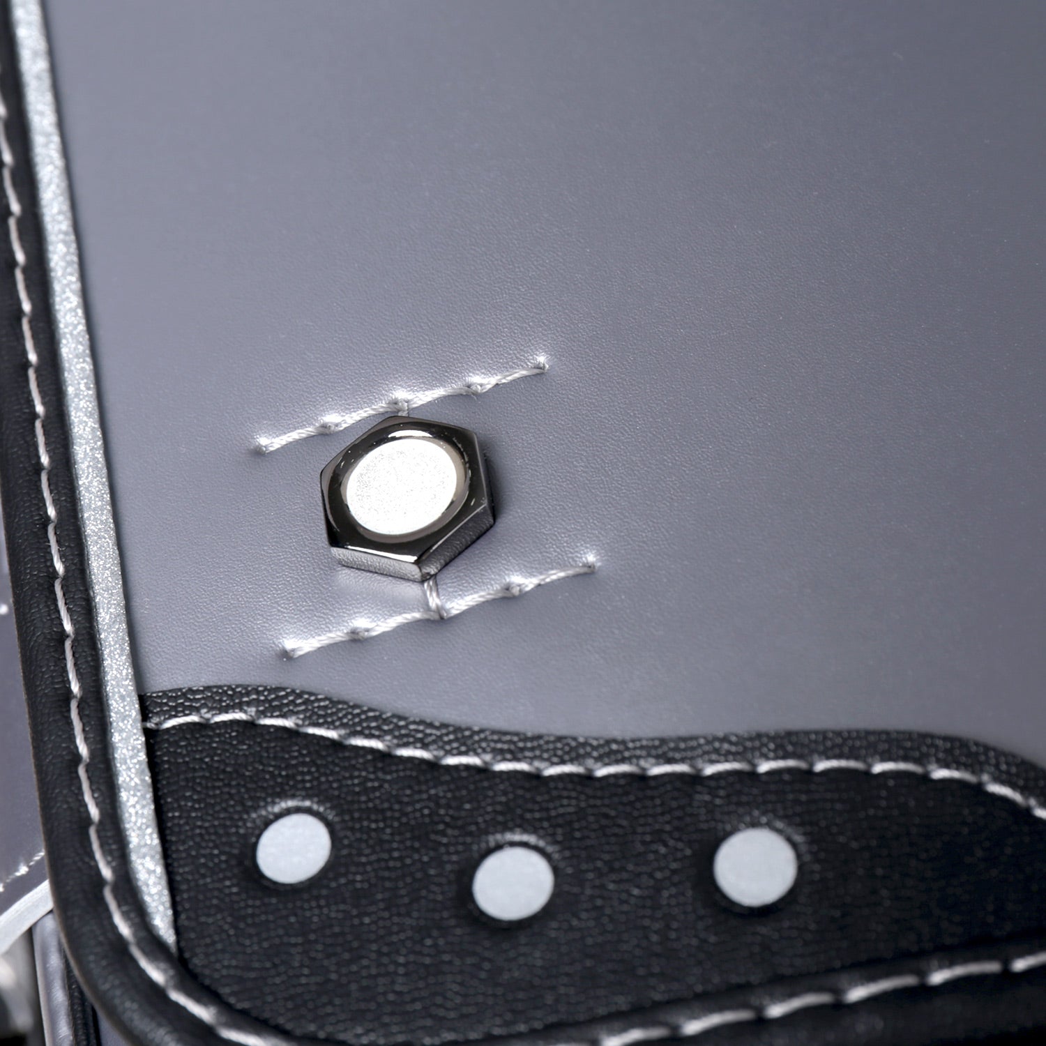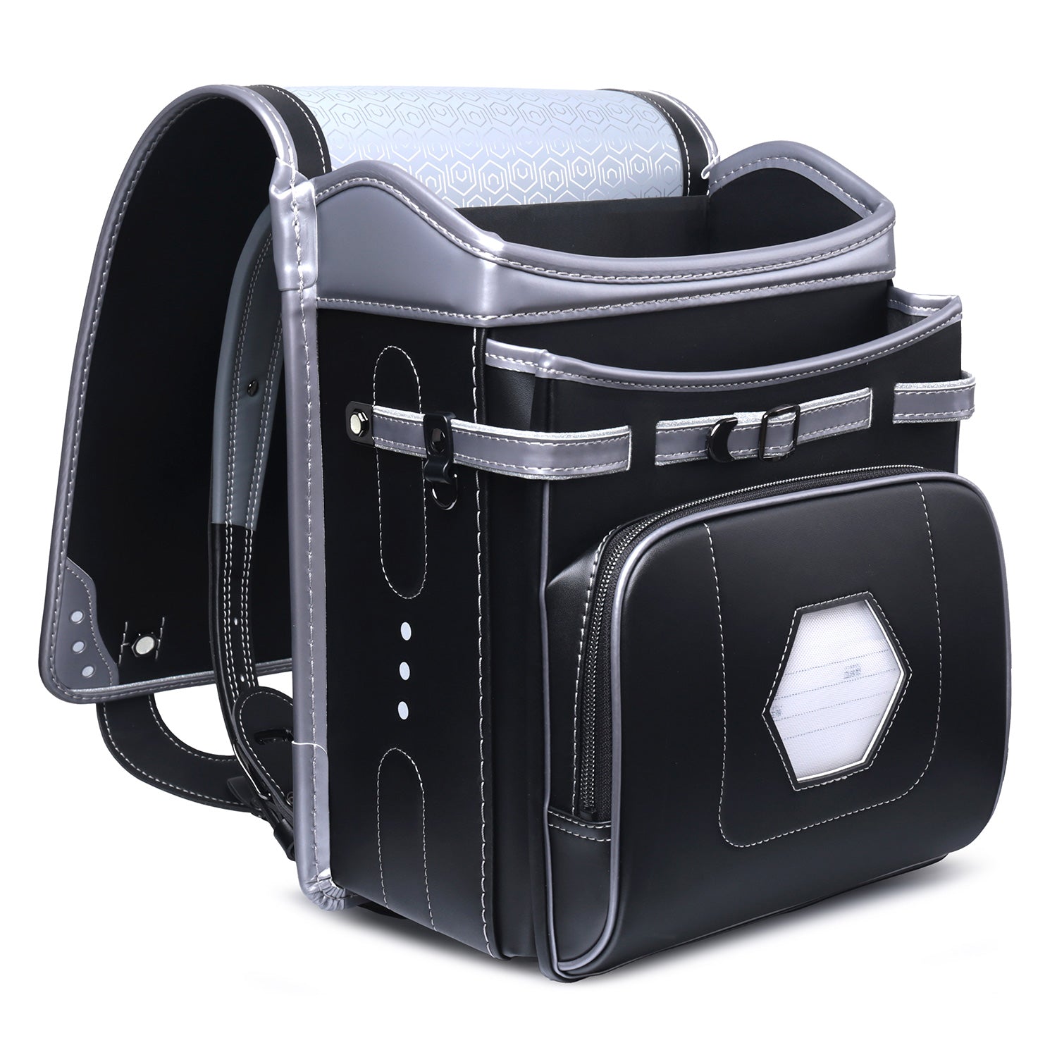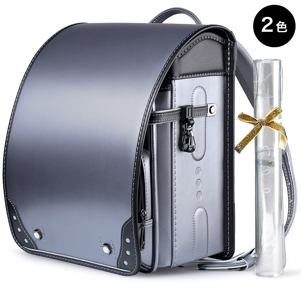 飽きのこないマットシルバーとブラックの配色。滑らかな権円形のラインと3つのドットの型押しが印象的。反射素材を組み合わせた、インターステラーを象徴するお洒落なランドセル。