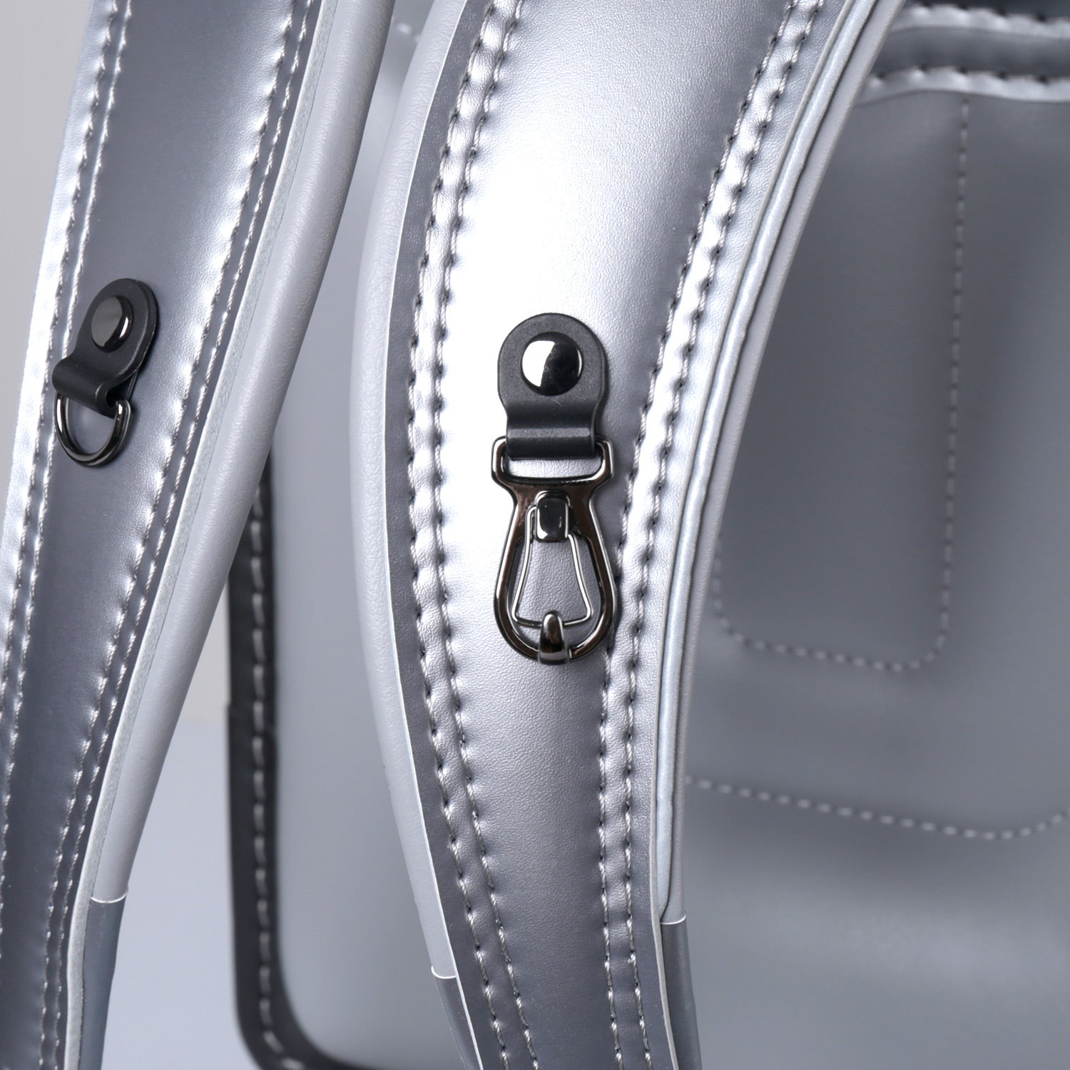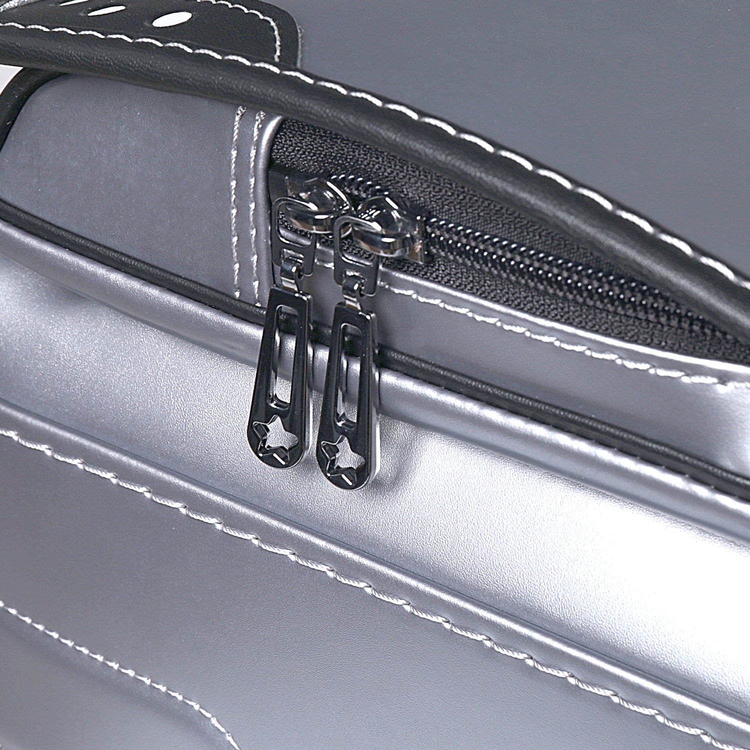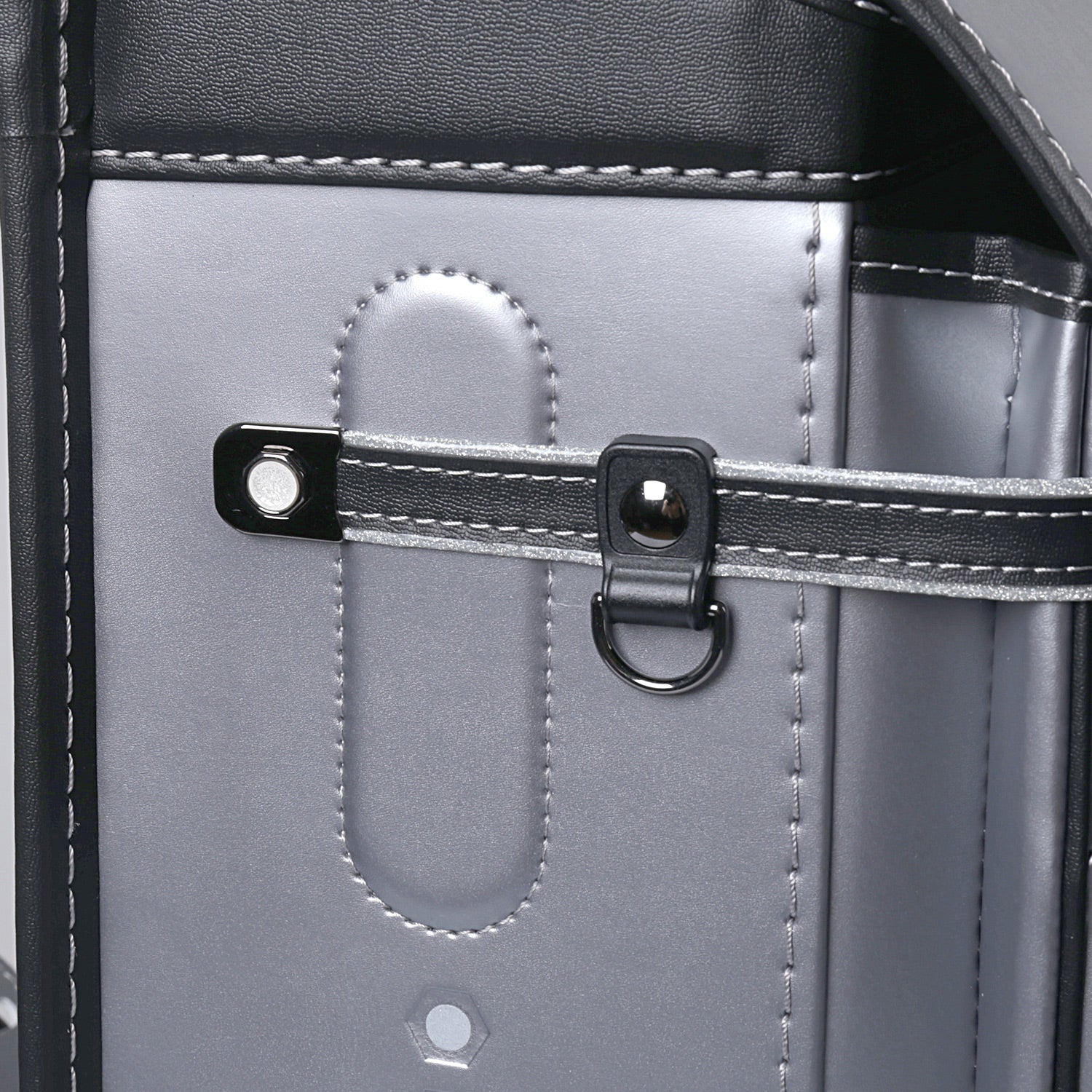 飽きのこないマットシルバーとブラックの配色。滑らかな権円形のラインと3つのドットの型押しが印象的。反射素材を組み合わせた、インターステラーを象徴するお洒落なランドセル。